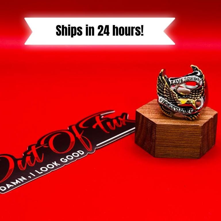 Command attention with the ultimate symbol of rebellion: the Biker Ring. Wherever you ride, show the world your true badassery with this Stainless Steel 18K Gold PVD Coated "Live To Ride" "Ride To Live" Eagle Biker Ring. Crafted from premium stainless steel and layered with 18K gold through advanced PVD coating, this ring showcases a bold eagle design etched with "Live To Ride" and "Ride To Live." It's not just an accessory—it's a declaration of your love for the open road. Perfectly polished to prevent any irritation, this ring combines style with comfort.