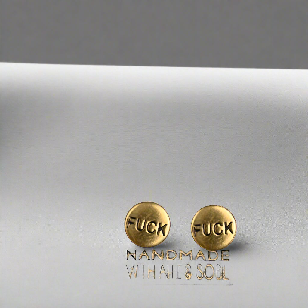 Edgy Brass Stud Earrings - Stamped 'Fuck' Design