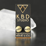 Embrace your rebellious side with these edgy brass stud earrings featuring a bold 'Fuck' design. Crafted from blackened and hand-polished brass for a sleek finish, these earrings offer a covert yet cheeky statement perfect for those up-close moments of playful revelation. Made with surgical steel posts, they're hypoallergenic and comfortable to wear. Whether you're looking to express your individuality or surprise someone with a sassy gift, these 8mm studs combine style, humor, and attitude. Materials: Brass Charm/ Brass Plated Gold, Surgical Steel Posts.