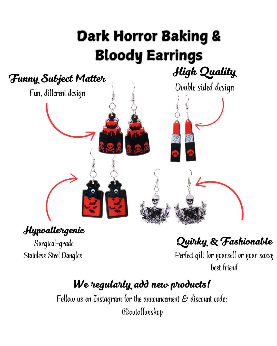 These striking Gothic Skull Jewelry pieces feature a black dangle design with vampire-inspired details, making them perfect alternative accessories for goth bakers and Halloween enthusiasts alike. Crafted with metal hooks, these dark jewelry pieces are ideal as a unique gift for horror fans, combining chilling aesthetics with high-quality construction.