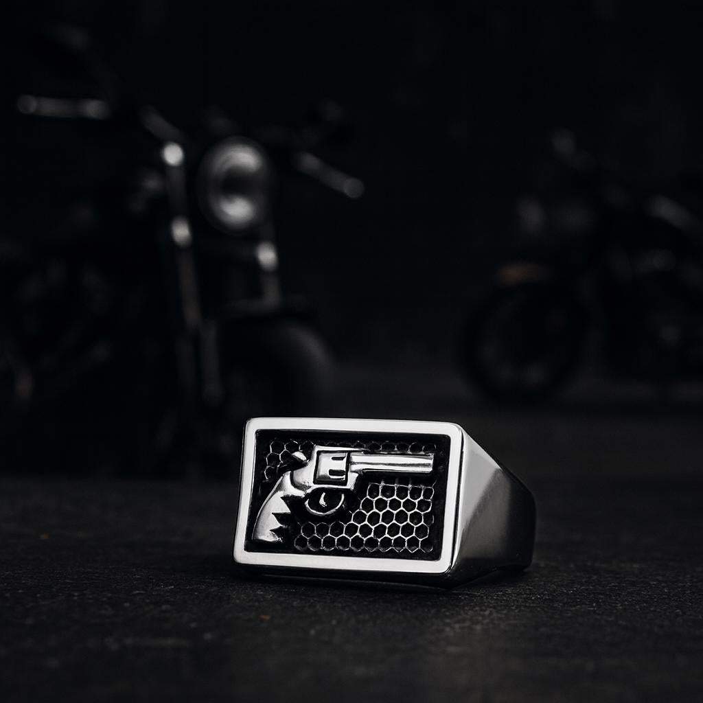 Men's Biker Ring - Pistol Revolver Gun in Silver Gold for Him - Titanium - Gifts for Men - High Quality - Unique Style