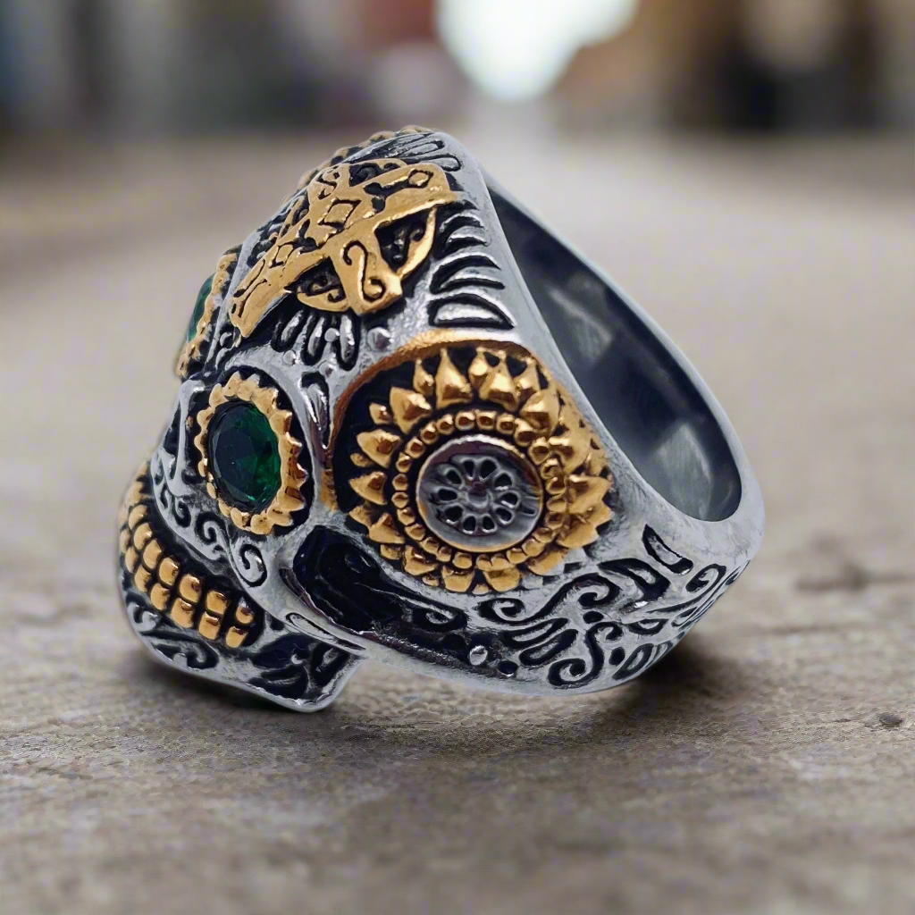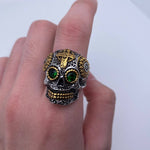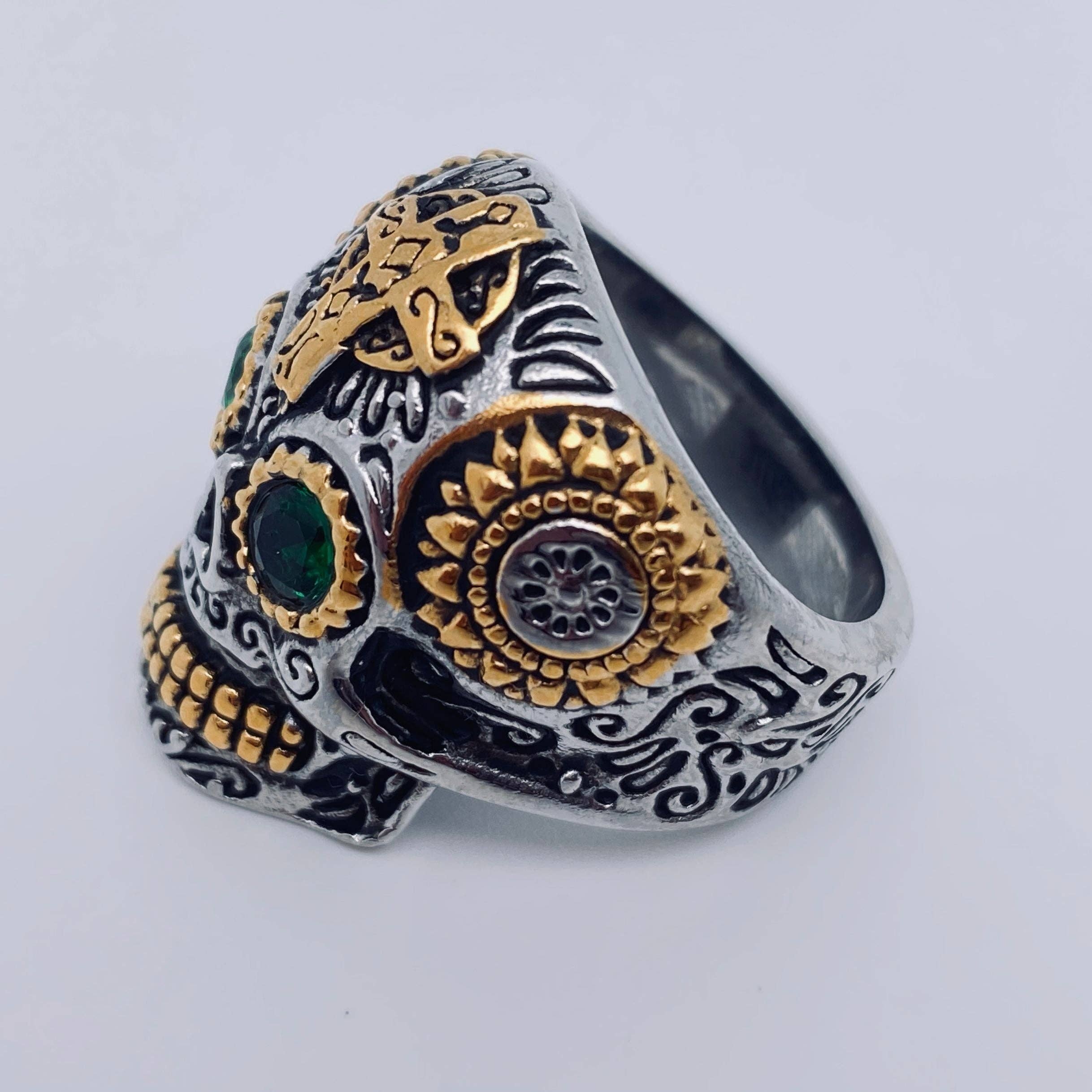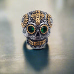 mens sugar skull ring atzec style with green cubic zirconia gemstone high quality 18K gold plated with stainless steel surgical grade titanium